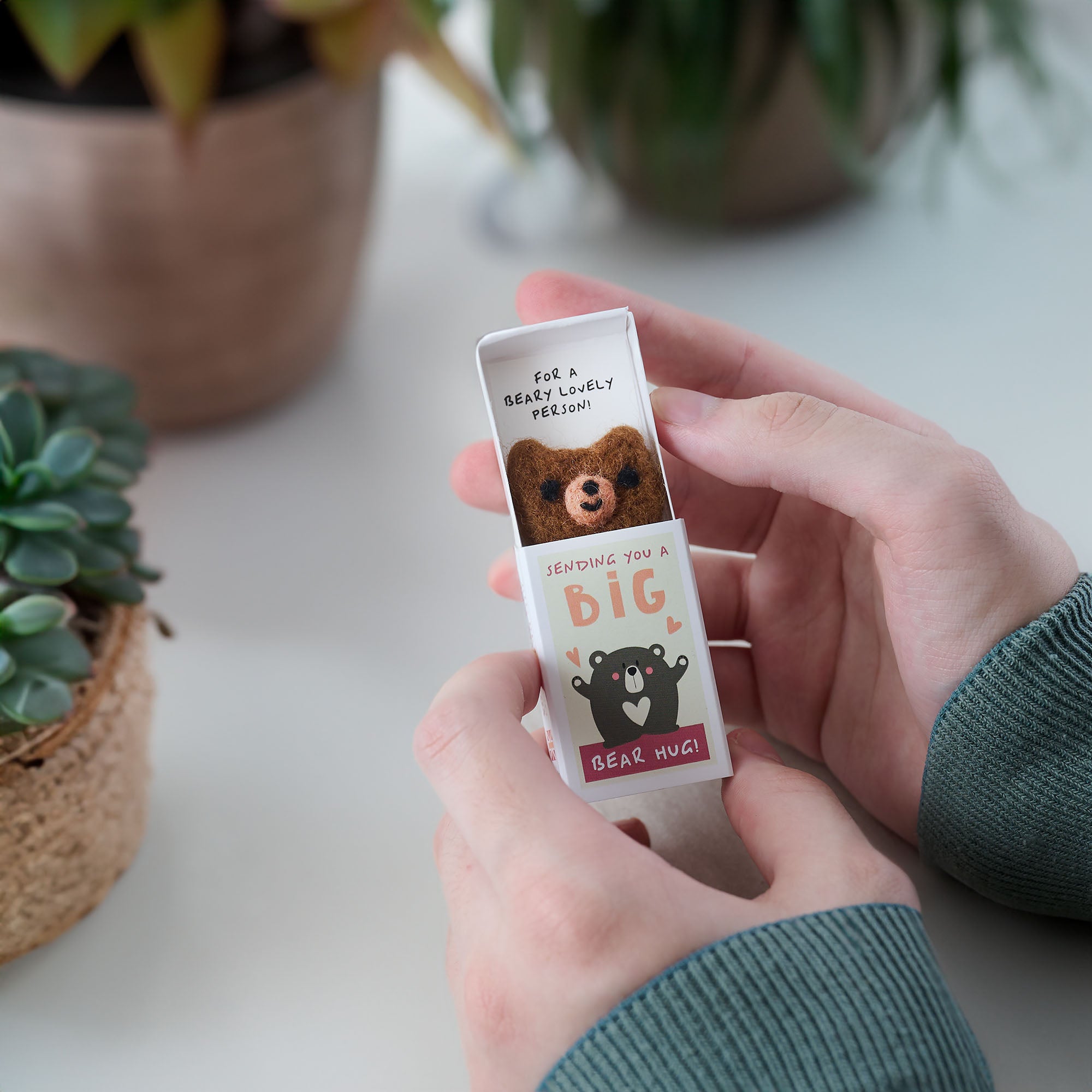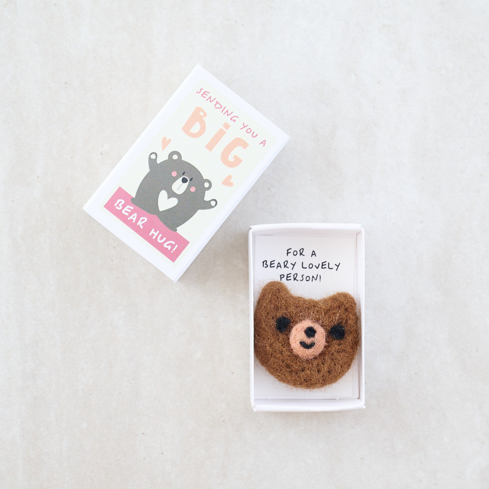 This enchanting matchbox, decorated with the message 'Sending you a big bear hug', is the perfect gift for a special someone, to let them know just how deeply they are cherished. Slide open the matchbox to reveal a handmade wool felt bear, accompanied by the heart warming message 'For a Beary Lovely Person!' This adorable gift is sure to put a big, bear-sized smile on their face!