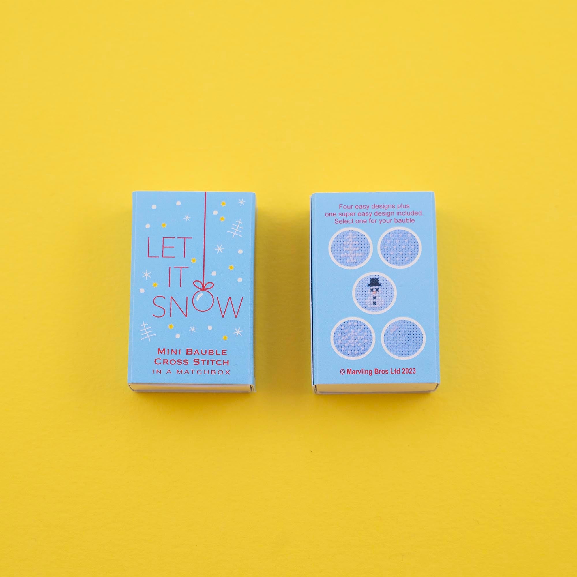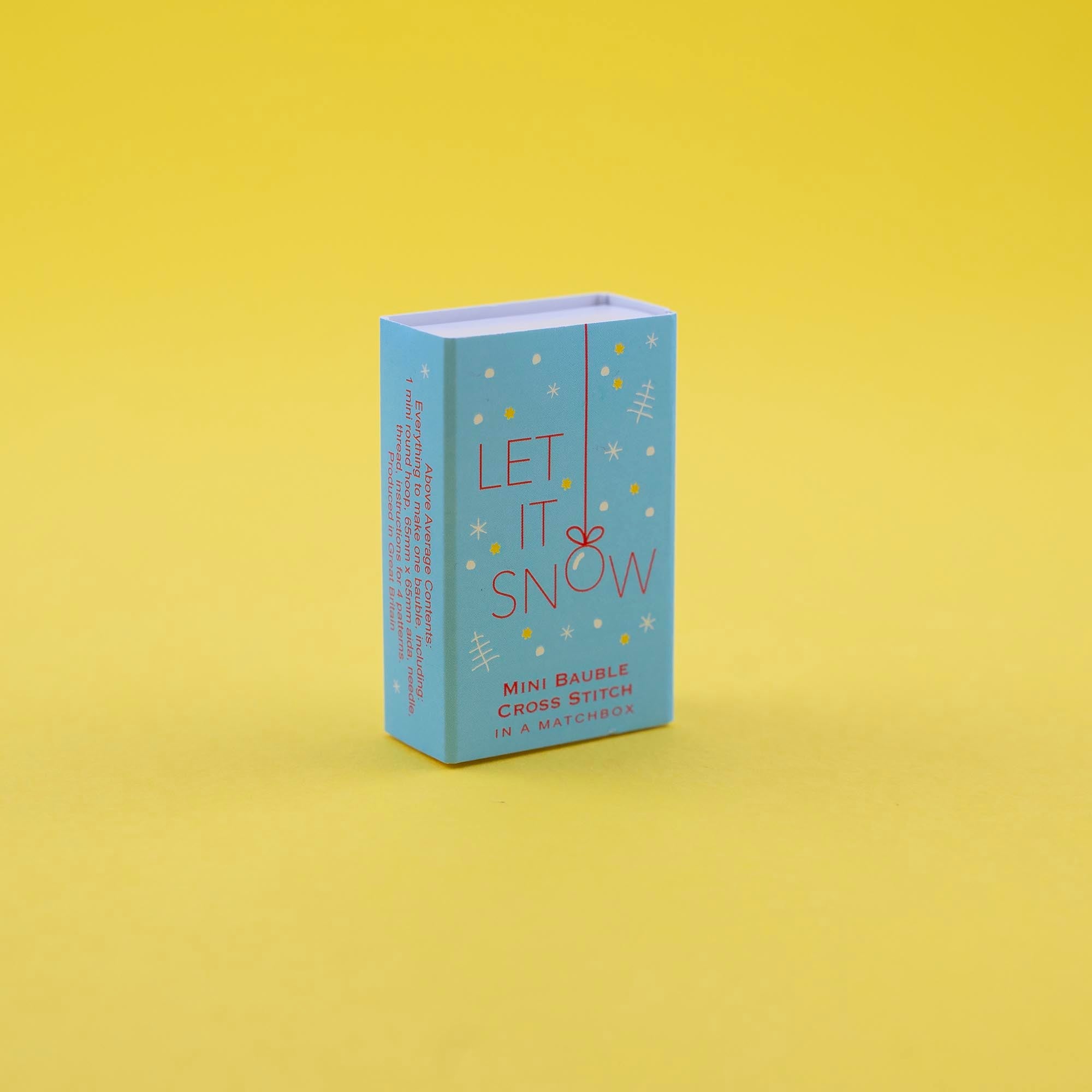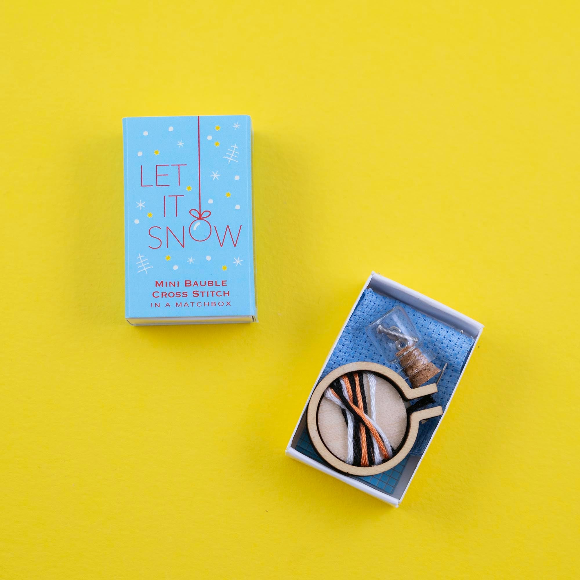 Mini cross stitch kit to make a Christmas bauble with four festive designs packed in a tiny matchbox.