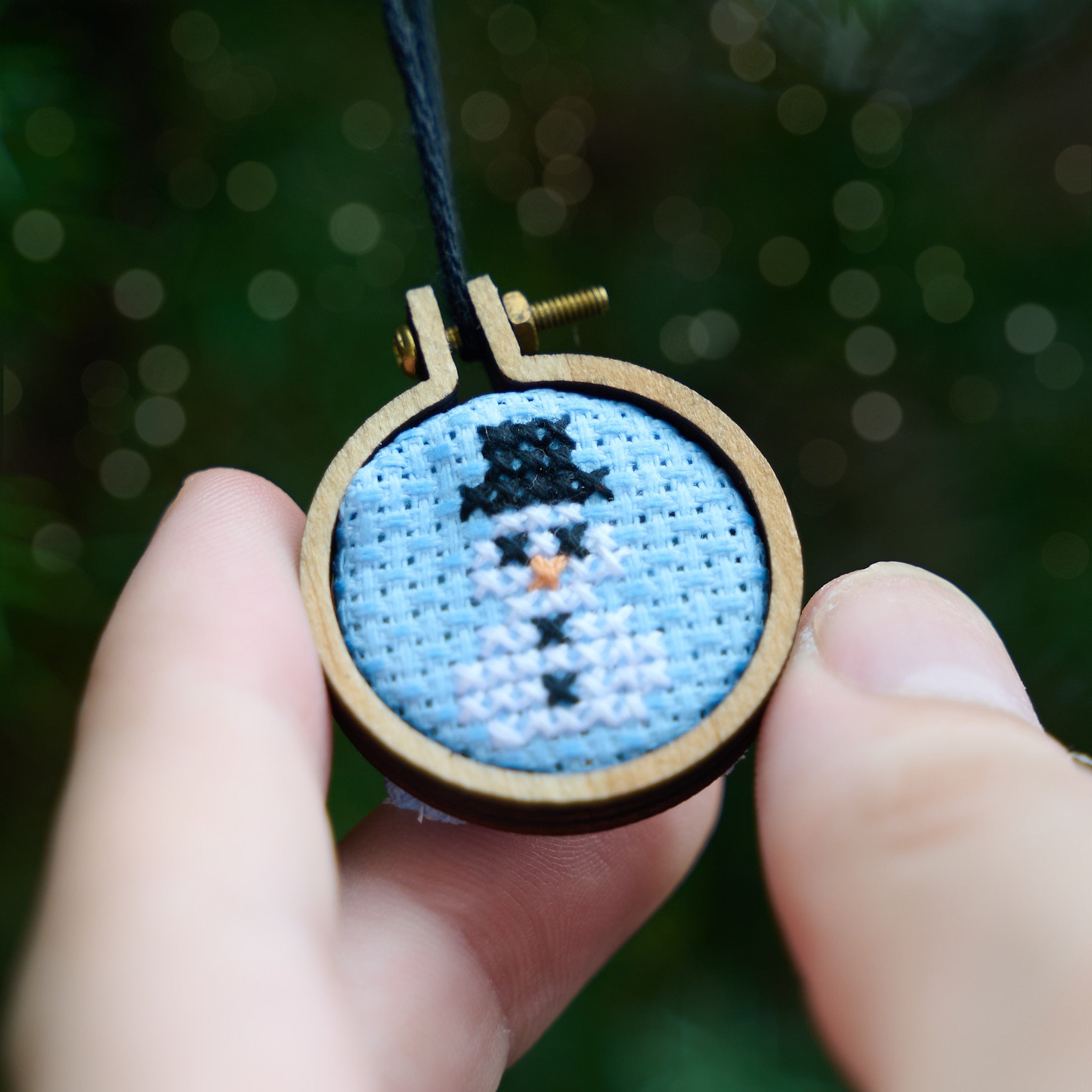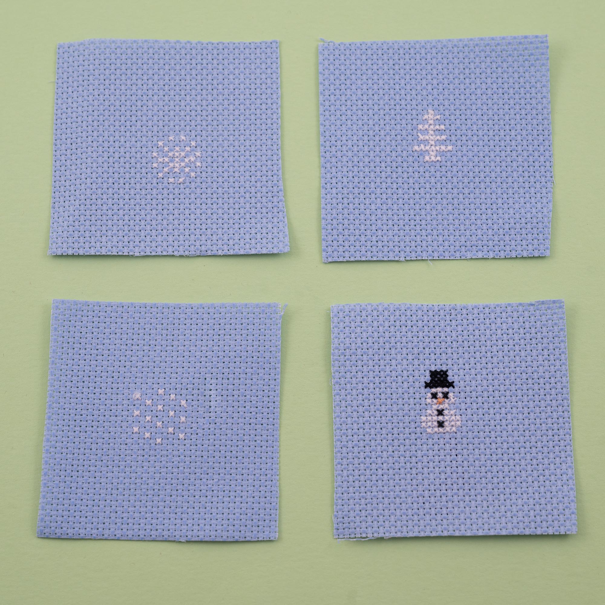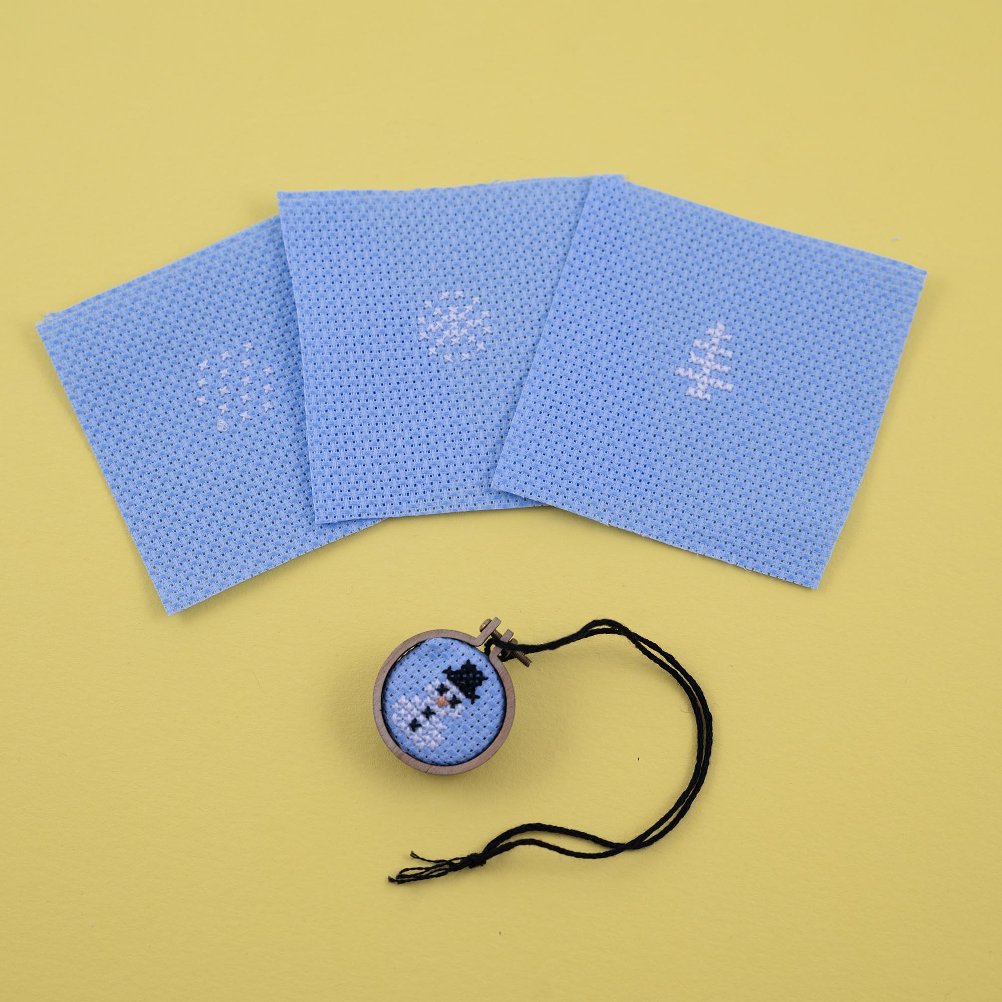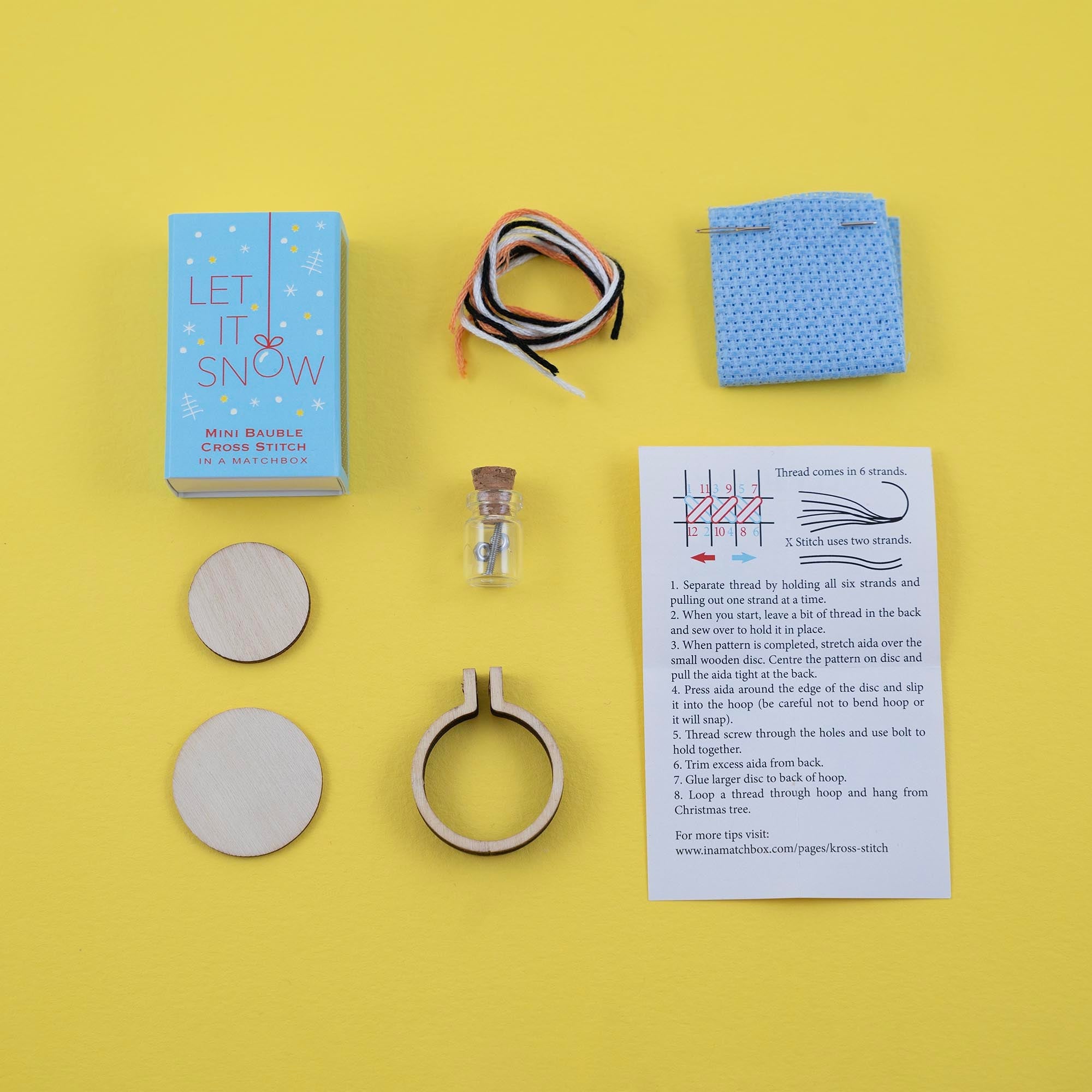 Mini cross stitch kit to make a Christmas bauble with four festive designs packed in a tiny matchbox.